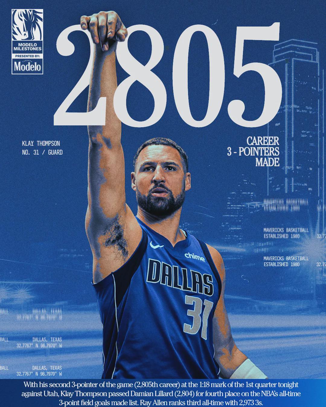 开云体育入口-2809记三分!恭喜克莱汤普森!NBA历史三分榜第四位