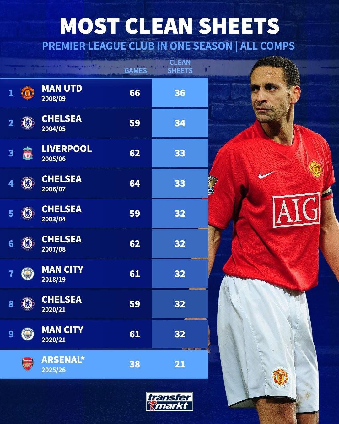 北京时间2月6日,德转列出了英超球队单赛季零封榜,2008-09赛季的曼联以各项赛事66场零封36次排名第一,本赛季的阿森纳38场零封21次有望最终跻身前10。